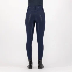 Technical riding tights in a breathable, polyester stretch fabric for rider comfort and movement made from a shape sculpting fabric offering compression. Full seat silicone print for grip and stability while riding. High flattering cut waistband with back zip pockets to keep valuables secure and laser perforated & colour contrast mesh cuffs for breathability and phone pockets with sporty detailing.