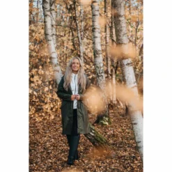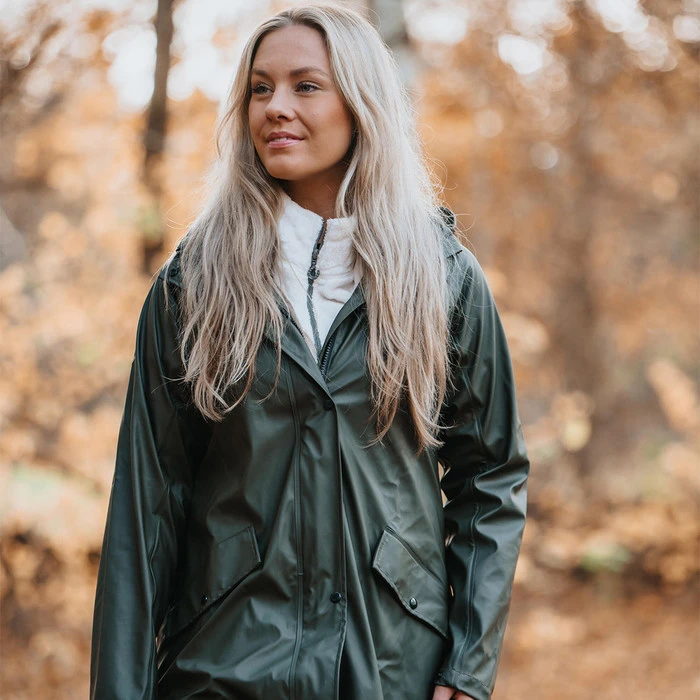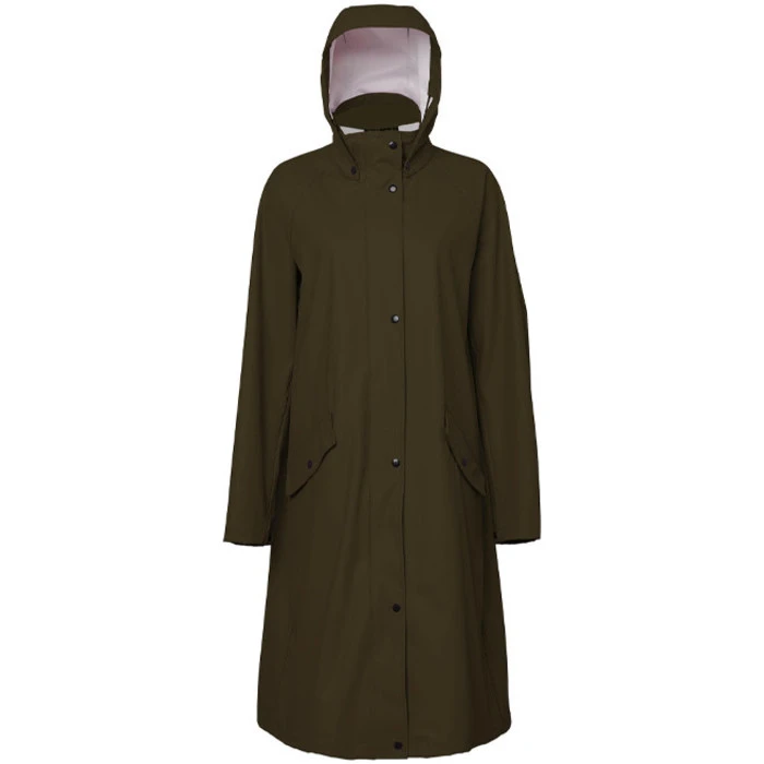 Waterproof long rain coat with welded seams. Two large front pockets, riding slit at back and reflective details.